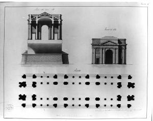 - NOTIZIE STORICO CRITICHE E' la prima delle due tavole presentate da Alessandro Monguzzi al concorso di II classe del 1853. Il progetto ottenne il II prenio. Il I prenio veme\nassegnato ad Alfonso Rosa. I disegni sono conservati nella cartella A I 194, contenente i saggi premiati ai concorsi di II classe di architettura.