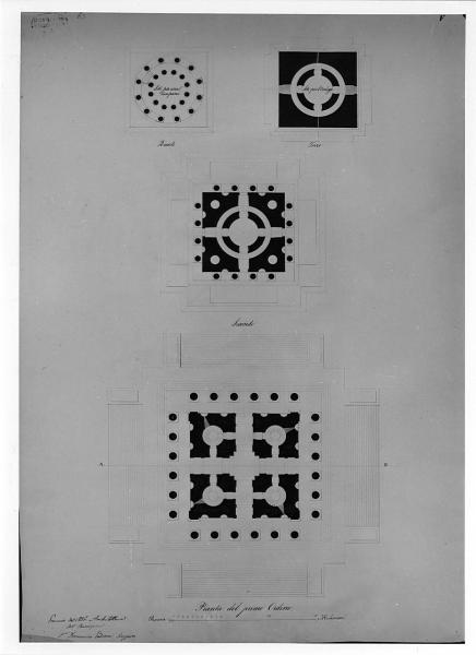Piante ai vari livelli con murature sezionate campite in china nera. Linea di sez. AB in china rossa (pianta del I p. inf.centro). Inf. pianta del primo ordine di edificio simmetrico quadrato con scalinate d'accesso ai 4 lati, 6 colonne per lato, e 4 scale a chiocciola poste sugli angoli. Al centro pianta del secondo ordine: pianta simmetrica cruciforme con vano al quadrato al centro con 4 colonne su ogni lato. Al centro del quadrato scala circolare e vano circolare centrale. Sup. a sin. pianta del IV ordine: pianta quadrata nella quale è iscritto cerchio delimitato da colonne che racchiudono un altro perimetro circolare di colome (sito per una campana). Sup.a ds. pianta del III ordine: pianta simmetrica con vano circolare centrale.