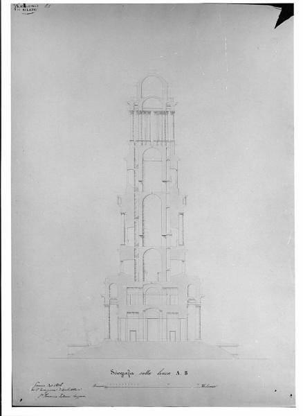 Progetto di una torre di città con campana ed orologio. architettura: torre campanaria con orologio (sezione)
