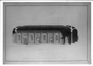 Sezione di Sala a china e bistro con ombreggiature più scure e parti sezionate campite in acquarello rosa. Sala a un piano con copertura a volta ribassata. Muratura intervallata da colonne ioniche che reggono una trabeazione continua, scanalate poste su basamento e tra le colonne nicchie con statue alternate a porte rettangolari sormontate da riquadri a bassorilievo (a ds. e a sin.) e sulla parte centrale, finestre rettangolari ornate da tendaggi. Al centro scalini e nicchia con statue. Alle estremità (ds.e sin.) colonna libera posta su base e vani con copertura a cupola. Il soffitto è decorato con lacunari ottagonali e rettangolari.