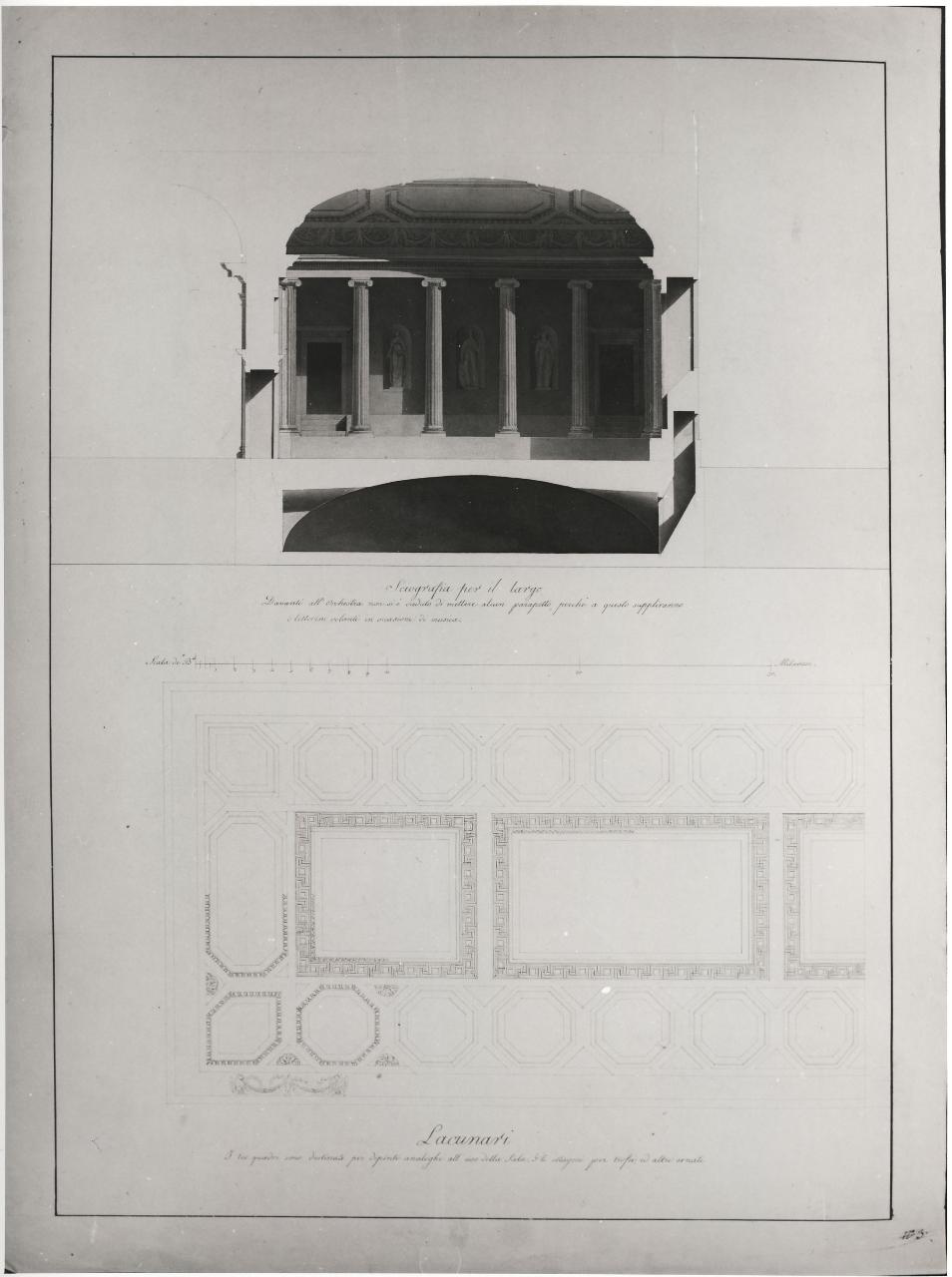 In alto: sezione trasversale di sala a china e bistro con ombreggiature più scure e parti sezionate in acquarello rosa. Sala a un piano con copertura a volta ribassata e piano interrato a volta. Nella sala un diaframna di colonne ioniche scanalate poste su basamento, con trabeazione e sup. soffitto decorato da riquadri a bassorilievi e da lacunari, scherma la parete di fondo nella quale vi sono a ds. e a sin.porte rettangolari, scalini e al centro 3 nicchie con statue inquadrate dalle colonne libere che fanno da diaframma. In basso disegno a china dei lacunari del soffitto: al centro lacunari rettangolari e lat. cornice di lacunari ottagonali e fascia decorati da festoni.