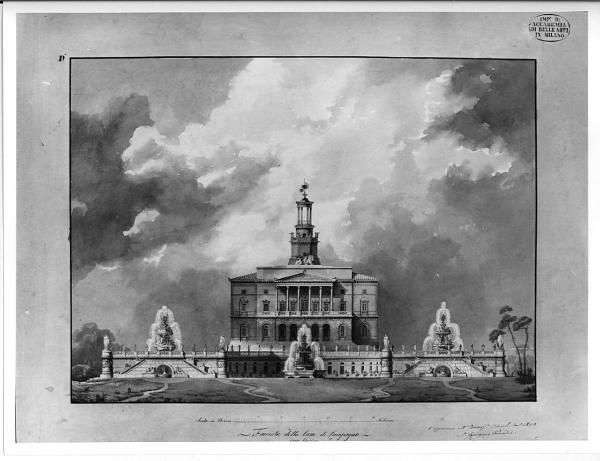 Prospetto di edificio a china e bistro con ombreggiature più scure, su sfondo sfumato. Linea di margine in china nera e bordo acquerellato in grigio.Facciata verso il giardino di edificio simmetrico a 3 pp. fuori terra posto su basarnento, accessibile da 2 scale poste all'estremità del basamento. Al centro esedra semicircolare con vasca al centro. Ingresso all'edificio preceduto da scalini. Parte centrale in aggetto: al pt. muratura in mattoni a vista, 6 archi; al I p. al centro loggiato corinzio, sormontato da timpano, finestre rettangolari. Lat. finestre rettangolari entro arco al I p. Finestre rettangolari piano attico. Copertura a padiglione. Al centro torretta sormontata da tempietto circolare coperto a cupola. Vista di parte del giardino.