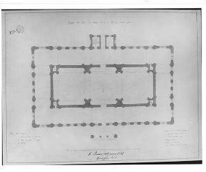 Pianta di edificio con murature campite a bistro. All'interno numeri di riferimento agli indici posti a sin. e a ds. del disegno. Vasta sala rettangolare con finestrature su tutti i lati. Al centro dei lati maggiori: in basso pronao d'accesso preceduto da scalini; in alto vano scala. Al centro della sala, sala più piccola rettangolare, con accessi sui lati lunghi, corrispondenti agli ingressi della sala più grande. La sala interna è divisa in 3 parti quadrate. Disegno delle proiezioni dei soffitti in linee tratteggiate.