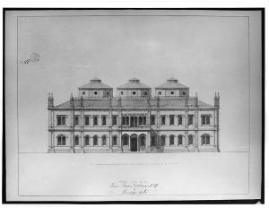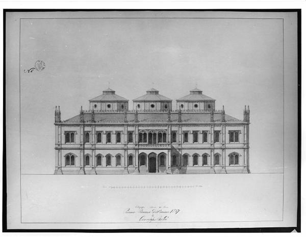 Prospetto di edificio in stile neogotico a china e bistro con ombreggiature su sfondo sfumato azzurro. Edificio simmetrico a 2 p. con parte centrale in aggetto tetto a padiglione sul quale poggiano tre torrette poligonali sormontate da lucernario. Ingresso preceduto da portico a 3 arcate ogivali, sormontato da loggia con 3 bifore e balaustra decorata. La muratura di facciata è intervallata da lesene sormontate da pinnacoli ornati da statue.