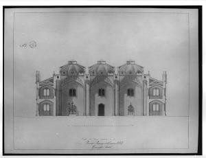 Sezione longitudinale di edificio in stile neogotico a china e bistro con ombreggiature su sfondo in acquerello azzurro sfumato. Murature sezionate campite in acquerello rosa, strutture del tetto in giallo. Grande vano centrale tripartito in 3 vani a tutta altezza da coppie di pilastri continui sui quali si impostano tre cupole ribassate con lucernario centrale. Al centro porta ogivale sormontata da bifora polilobata. Ai lati statua equestre a sin. e monumento funerario a ds.; sup. bifore polilobate. Lat. corpi più bassi a 2 p. con copertura a unica falda. Al pt. e al 1 p. bifore polilobate.