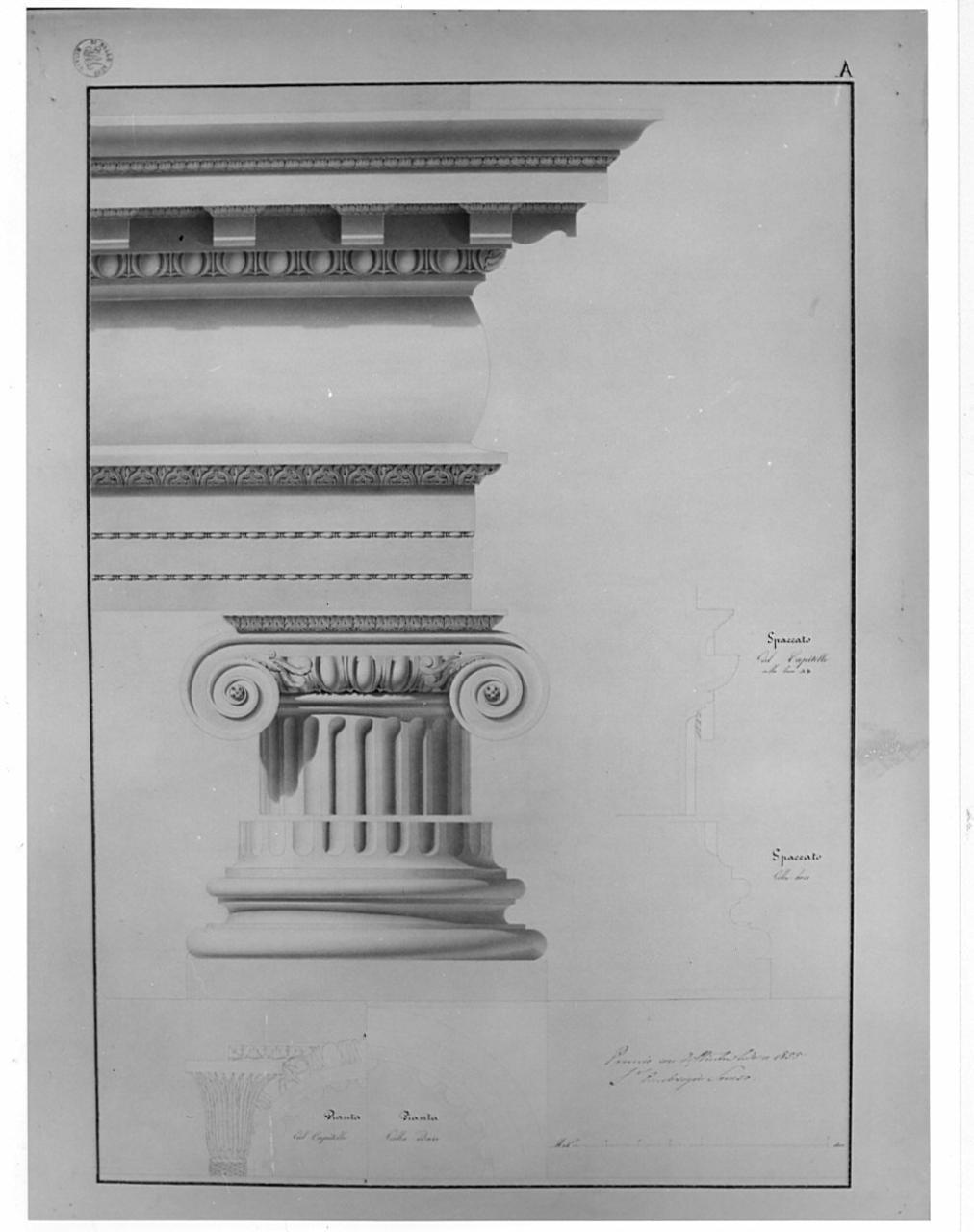 Dettaglio (alzato) di trabeazione ionica a china e bistro con ombreggiature più scure. A ds., al centro del foglio profili del capitello e della base acquarellati in rosa chiaro. In basso, pianta del capitello e pianta della base della colonna, con parti sezionate campite in acquerello rosa. Il fondo della tavola è acquarellato in azzurro sfumato.