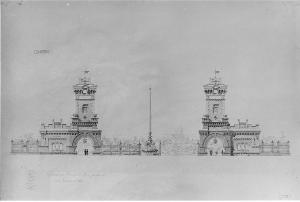 Progetto di barriera daziaria per Porta Tenaglia. Realizzato su carta pesante. Prospetto a china di due edifici simmetrici raccordati da una cancellata (interrotta a destra). Al centro: fontana su base poligonale con vasca circolare a cannelle, corpo centrale cubico con vasche su colonne agli angoli, serie di elementi con decorazioni zoomorfe e asta metallica terminale. Gli edifici, di architettura neomedievale, sono composti di un elemento a torre con base porticata (all'interno gruppi di figure) e di un corpo basso con coronamento a profilo spezzato. Sullo sfondo, oltre una cortina alberata, veduta urbana a china e matita da cui emergeil profilo a guhlie del Duomo di Milano.