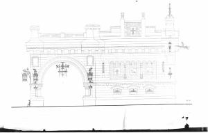 Prospetto di edificio neomedievale, in conci in pietra, su basamento liscio con cornicione a mensole e coronamento a parapetto intervallato da motivi turriti in aggetto. A sinistra ampia arcata con ghiera modulata su basse colonne con capitello a foglie stilizzate, affiancata superiormente da cartelle con emblema emblema e scudo. A destra: basse finestre arcuate con cimasa ad arco ribassato sormontate (oltre il marcapiano) da triforio cieco ad archetti pensili su pensili su colonne con capitello a piccole volute e basamento a figure stilofore su peducci (all'interno stemmi di Firenze Roma e Venezia). Superiormente: stemma di Milano inquartato da pilastri con protome leonina. Elementi decorativi metallici in fitto tratteggio verticale.
