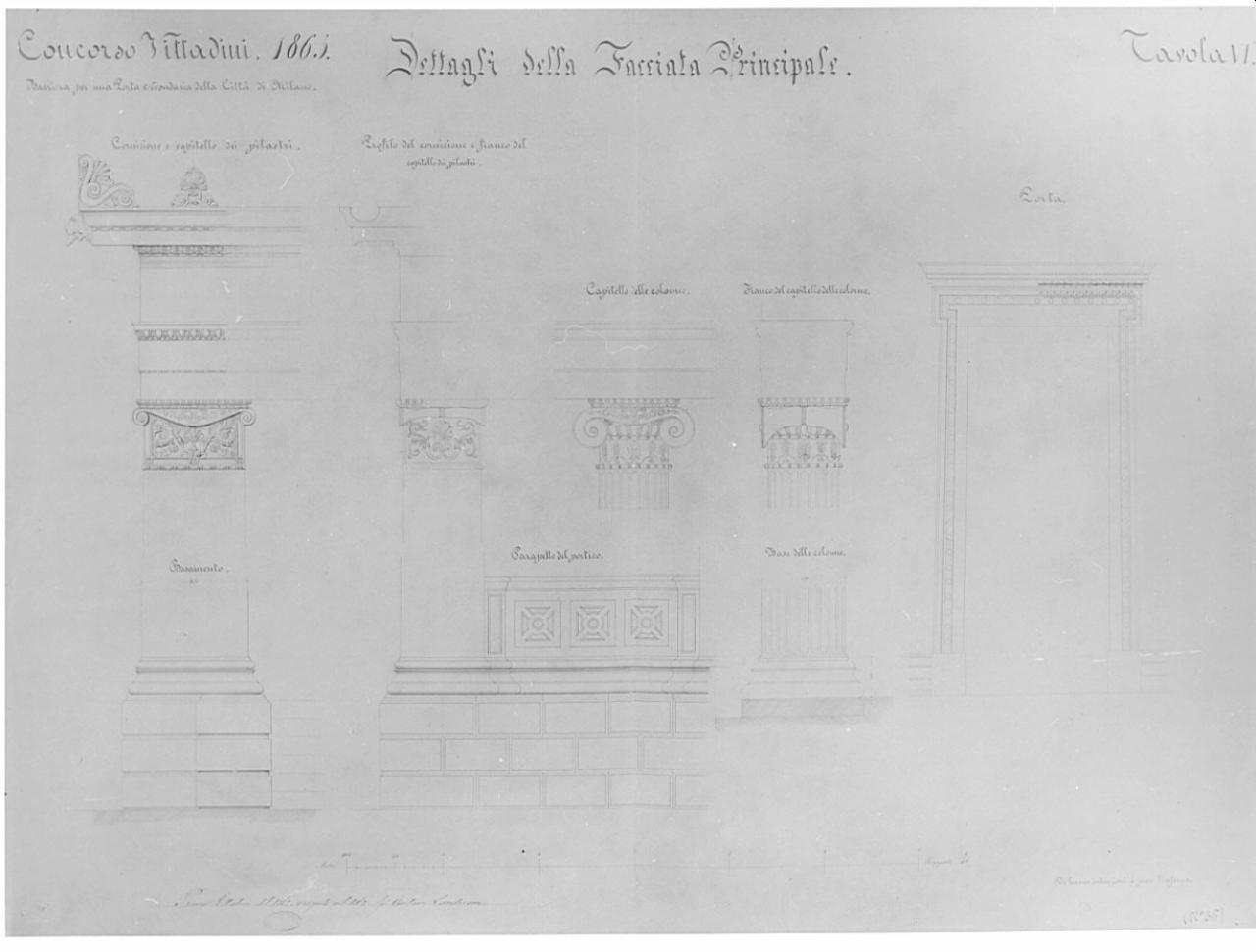 Dettagli a china e matita della facciata principale, corredati da didascalie e quote in china. A sinistra: basamento su plinto bugnato e capitello con decorazioni fitomorfe di pilastro pseudoionico sormontato da trabeazione ionica con protome leonina e acroteri a palmette. Al centro: fianco di pilastro pseudoionico su base bugnata, visto di profilo, sormontato da trabeazione ed affiancato da parapetto a motivi geometrici. Base e capitello (fronte e fianco) di colonna ionica scanalata. A destra: portale con vano trapezio con cornice decorata solo parzialmente (in alto a destra).