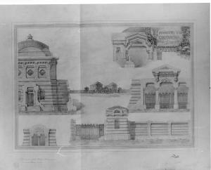 Progetto di cimitero secondario per la città di Milano su di un'area rettangolare di mq 70000. architettura: cimitero secondario per la città di Milano (prospetti, particolari, prospettiva)