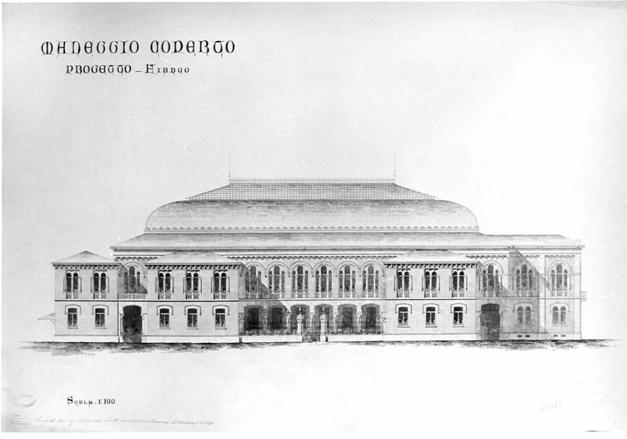 Maneggio coperto da costruirsi in un parco o giardino di una grande città. architettura: maneggio coperto (prospetto)