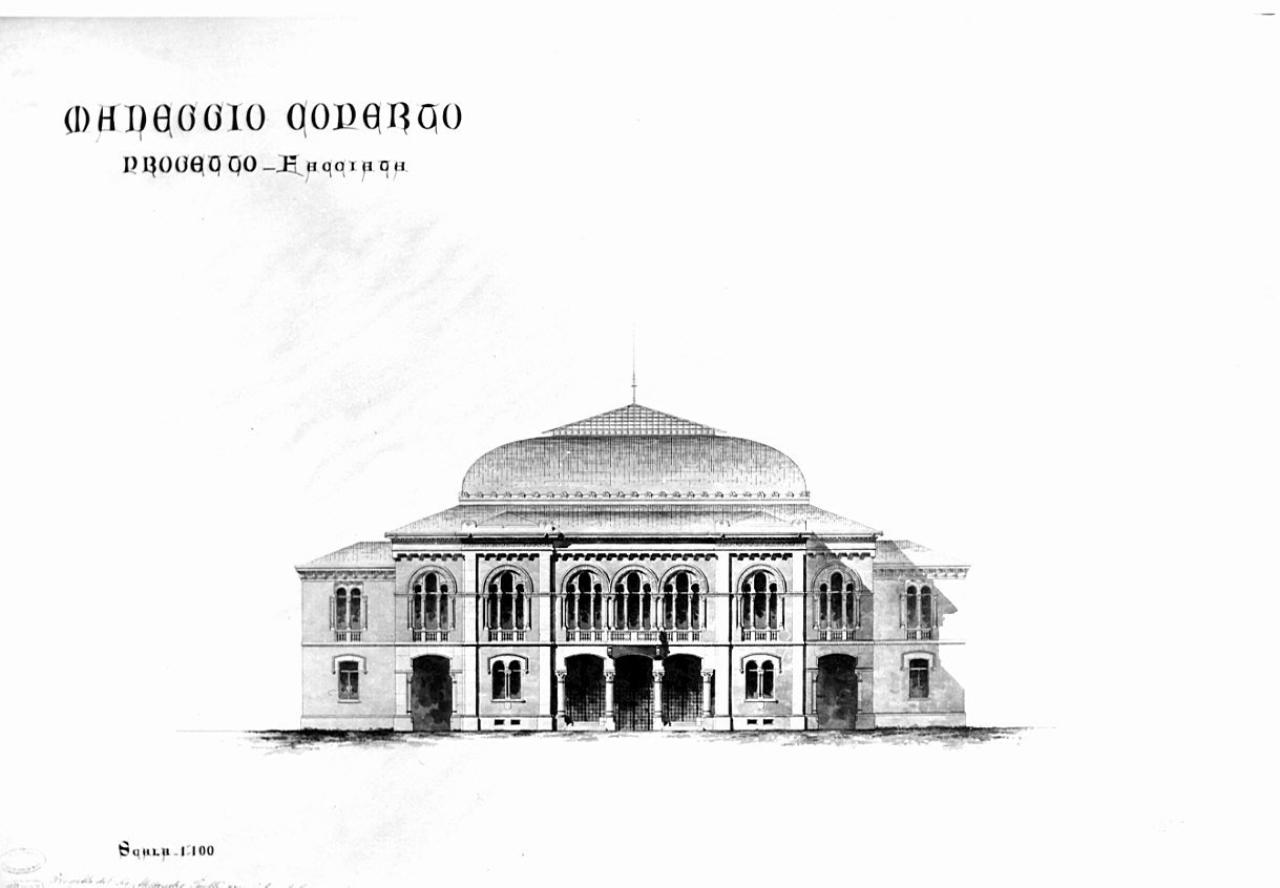 Maneggio coperto da costruirsi in un parco o giardino di una grande città. architettura: maneggio coperto (prospetto)