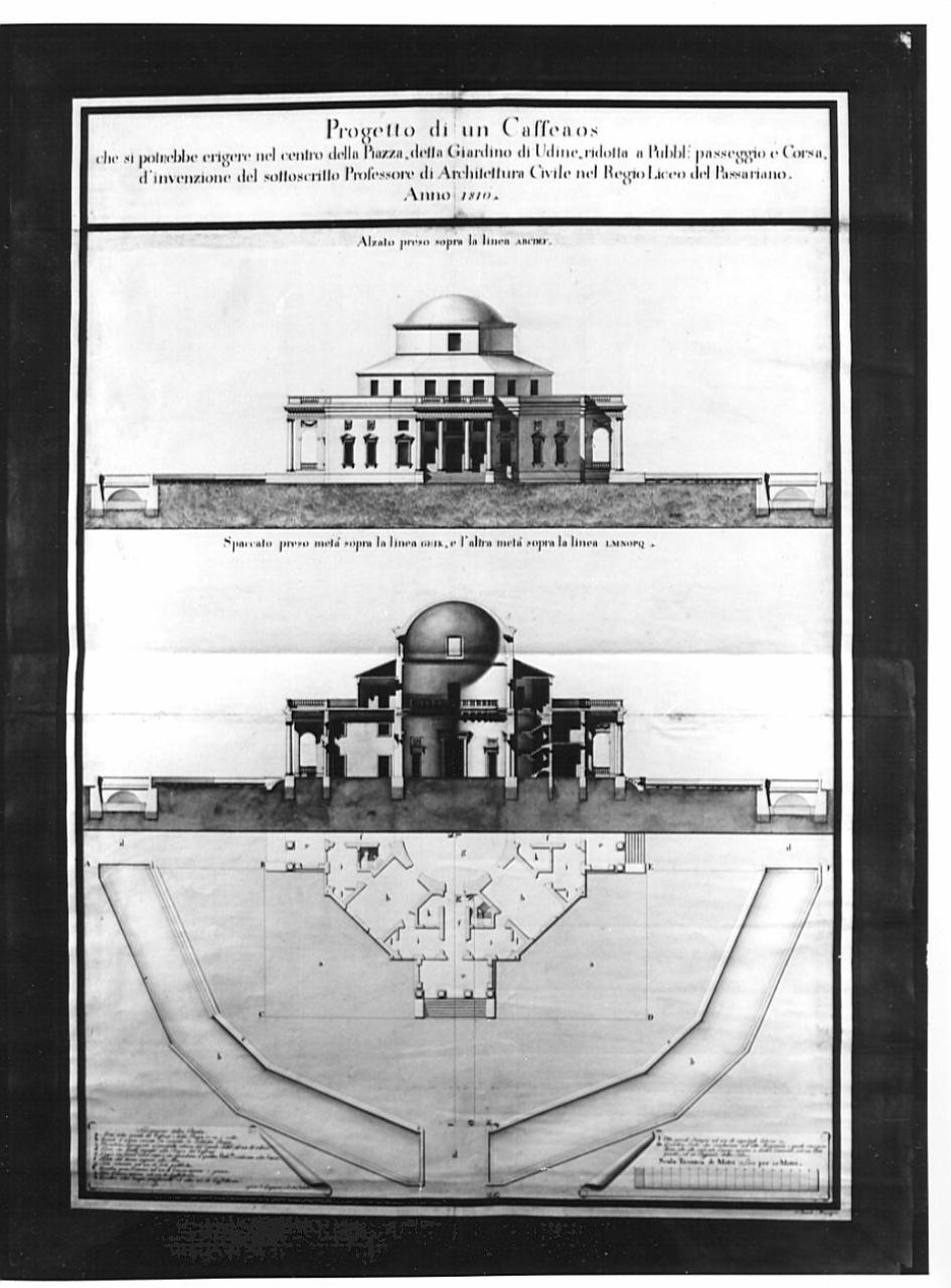 Progetto di coffehouse a china e acquarello. Inf. : pianta di edificio ottagonale fornito di quatro pronai preceduti da gradinate, con sistema di canalizzazione dell'area adiacente. Centro: sezione dell'edificio sulla sala centrale circolare, sugli ingressi attigui e sui pronai, con vista dei passaggi esterni, dei ponti e delle canalizzazioni. Superiormente: alzato dell'edificio con vista dei pronai con 4 colonne ioniche sui quali corre una terrazza marcapiano che precede una copertura a cupola preceduta da un primo tamburo con aperture rett. e coperture a spioventi che precede un II tamburo liscio con finestra centrale.