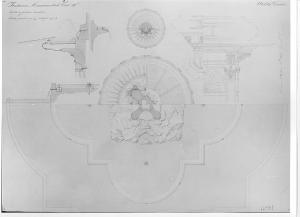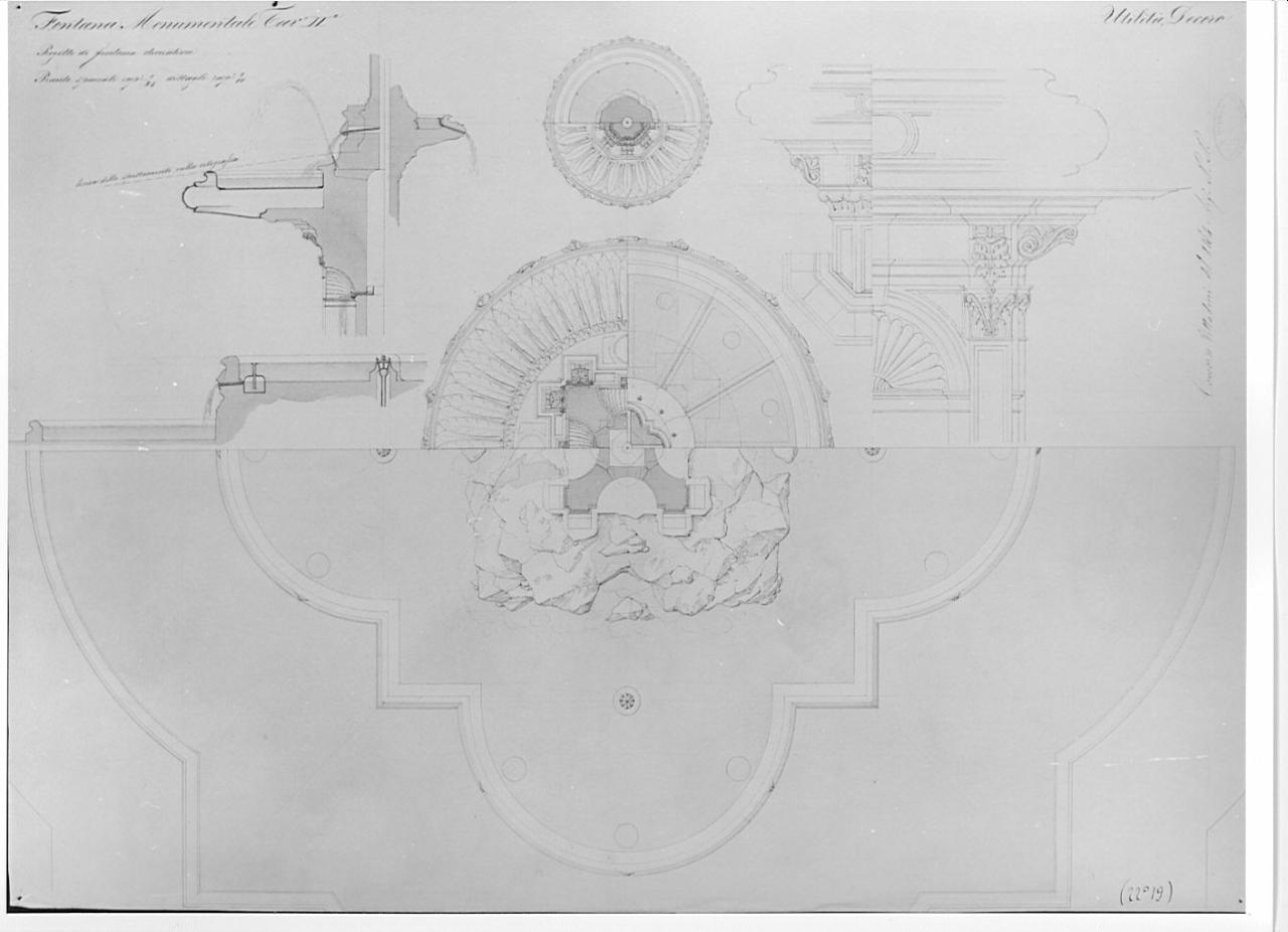 Piante, sezioni e particolari di fontana a china con vasche campite in acquarello azzurro e definizione del sistema idraulico in inchiostro blu. Al centro sez. orizzontale a diverse quote di fontana a vasche concentriche di dimenzioni degradanti: vasca più grande polilobata contenente vasca più piccoadi uguale forma, al centro basamento quadrato con nicchie semicircolari sui lati coppie di pilastri sporgenti sugli spigoli poggianti su scogli. Vasca più piccola, sostenuta dal basamento di forma circolare (per metà vista dall'alto e per metà dal basso. Al centro della tavola, sup vascacircolare (vista per metà dal basso in alto e per l'alta metà dall'alto in basso). A sn. al centro sezione di 2 vasche con ind. delle bocchette dei canali di uscita delle acque. A sinistra disegni dei profili delle vasche e dei piedistalli.