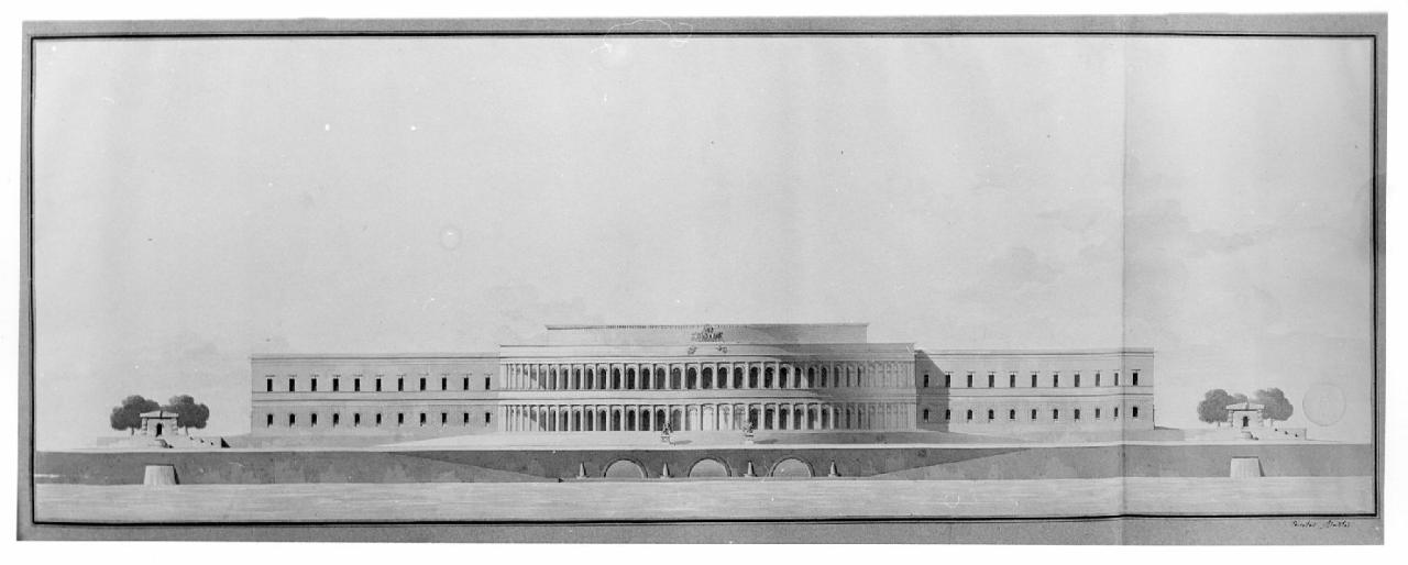 Alzato di edificio militare a due ripiani a china e bistro su fondo chiaro acquarellato grigio e beige, entro bordo cartaceo riportato azzurro. Vista del corpo circolare porticato al centro, con doppio ordine di archi a tutto sesto fiancheggiati da colonne doriche e tuscaniche. Lateralmente corpi di fabbrica con primo piano a bugnato liscio con finestre centinate, piano superiore liscio con finestre\nquadrangolari concluso da cornice. Inf: vista di corso d'acqua, di 3 gallerie ad arco centrale e 4 fontane. Lat.: 2 edicole con fontane e cascate a diversi livelli.
