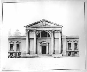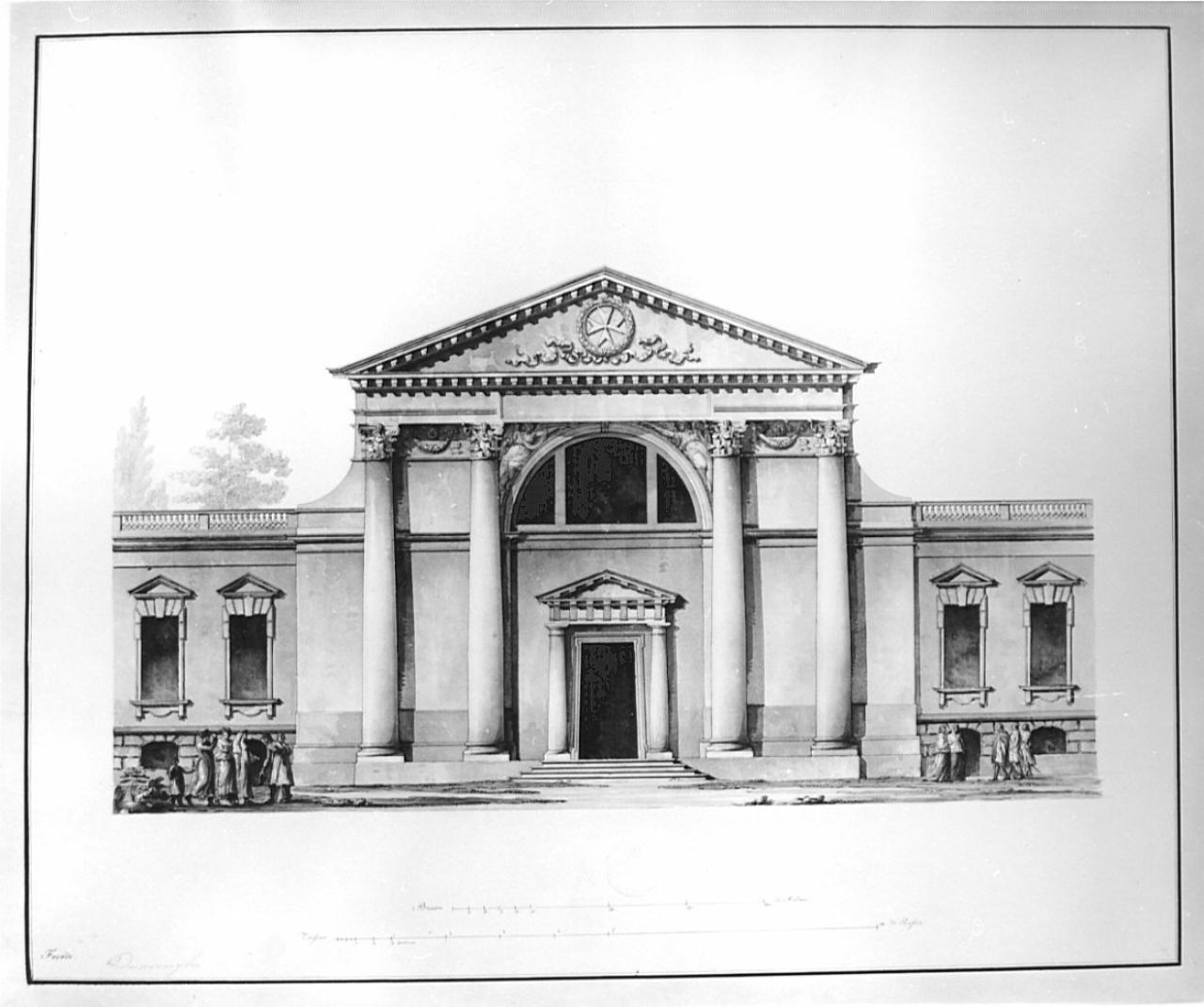 Prospetto della cappella dei cavalieri di Malta nel palazzo Voroncov a Pietroburgo. Prospetto di edificio adibito a Cappella a china, bistro e acquarello ocra e beige, acquarello rosa verde e azzurro per figure e prato antistante. La facciata inserita in un muro finestrato sormontato da balaustra, presenta 4 colonne d'ordine gigante con fusto liscio e capitello corinzio con trabeazione e timpano scolpito con Croce di Malta in ghirlande di alloro con nastri svolazzanti. Al centro apertura rettangolare con modanature fiancheggiate sorreggenti una trabeazione. Al centro grande apertura termale. Entro passe-partout.