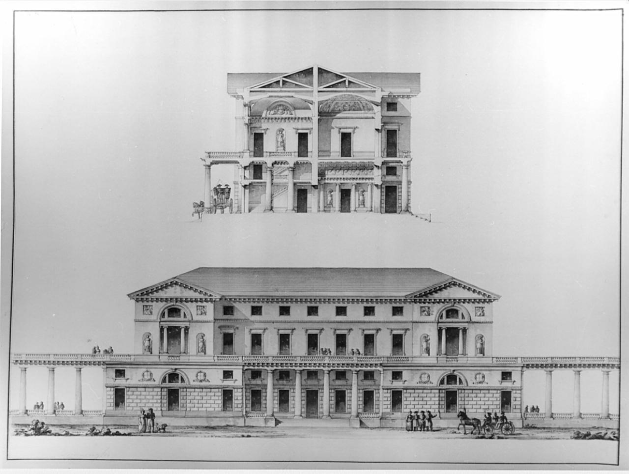 Prospetto e sezione di un palazzo per un ricco signore. Prospetto e sezione trasversale di edificio a china, bistro e acquarello rosa, azzurro, verde, marrone in varie sfumature entro doppia marginatura a china. Inf.: prospetto di edificio a 2 piani oltre al mezzanino e attico inserito in camminamento porticato e terrazzato. AI centro atrio porticato con colonne giganti tuscaniche tra 2 corpi di fabbrica con muro a bugnato liscio con 3 finestre rettangolari, mezzanino liscio con finestrine e finestra termale intercalate da stemmi in ghirlande. Superiormente terrazza centrale, balaustra del camminamento tra due corpi con aperture centrali tripartite e sormontate da finestra termale. Sezione superiore trasversale con vista dei due ingressi e di quattro vani interni delle capriate e delle falde del tetto.