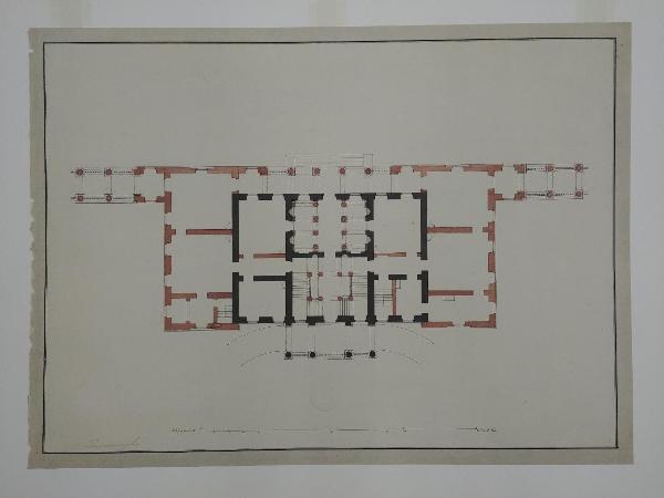 Planimetria di un palazzo per un ricco signore. Pianta di edificio a china e bistro con sezione delle murature acquarellate color seppia (interventi nuovi) e nero (preesistenza) su fondo chiaro entro doppia linea di margine a china e bordo grigio. Pianta del piano terra del palazzo con pronao accessibile per le corazze, grande vano scale con colonnato e pilastri e atrio, vani adiacenti inseriti in un ampliamento con nuovi e grandi ambienti raccordati al camminamento colonnato.