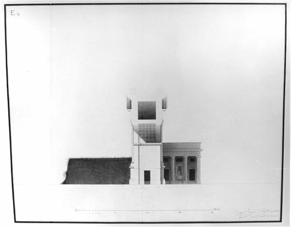 Sezione dell'arco di Porta Nuova. Sezione di porta urbana a china, bistro e acquarello ocra e verde su fondo chiaro, entro doppia linea di margine a china. Vista di parte delle mura, dell'intradosso dell'arco con copertura cassettonata con sezione dell'attico e delle sottocornici. Vista del fianco dell'edificio adiacente con colonnato dorico preceduto da 3 gradini, della fontana centrale e delle aperture inferiori e di quelle degli amnezzati.