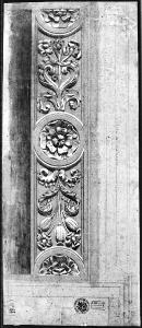 Disegno del rilievo di Palazzo Vitelleschi con pastello verde, bianco e grigio su carta incollata a cartoncino. Particolare di architrave di porta, a pastello grigio, verde e bianca. Il motivo è caratterizzato da una rosetta centrale e due laterali che chiudono la fascia e sono dimezzate e inscritti in una semicirconferenza. Tra le rosette due motivi floreali: un ramo con 5 fiori di papavero ed uno con 3 anemoni. All'estrema destra, a matita, metà prospetto di porta con le quote della cornice superiore dell'architrave e la sezione.