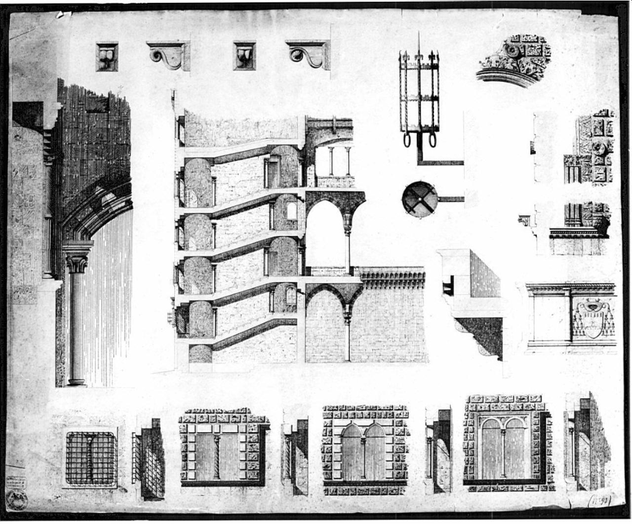 Disegno a china nera su 2 fogli di carta incollati (quello dietro giuntato in fondo). Rilievo di Palazzo Vitelleschi. Serie di particolari architettonici di edificio a china nera con ombreggiature. In basso da destra sezione e prospetto di bifora a tuto sesto chiusa in cornice quadrangolare, con colonnina centrale; sezione e prospetto di bifora ad ogiva contornata da cornice a bugnato liscio, colonnina a sezione di croce greca a losanghe: sezione e prospetto di finestra rettangolare bipartita da colonnina scanalata, circondata da cornice piatta. Al centro: sezione di parte di edificio. In evidenza le rampe e l'inizio del loggiato del 1°piano e del 2° piano In centro a destra: sezione e prospetto di parte di balcone con mensole caratterizzato da stemma al centro e da 2 colonne. Il c. sin: particolare di finestra (sezione) con cornice ad anelli, che si eleva rispetto al piano caratterizzato da parte d'arco ribassata poggiante su colonna liscia con capitello fitomorfo.