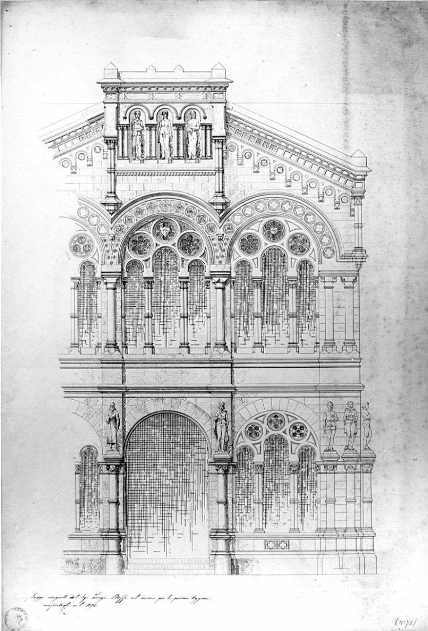 Progetto di palazzo (particolare della facciata), a china color seppia su carta. Particolare, in parte ombreggiato del prospetto di palazzo (campata centrale, destra e parte della sinistra). P.t.: accesso con 3 gradini che porta ad un loggiato con arco a tutto sesto e trifora con arco a tutto sesto con tondi quadrilobati. Ai lati dell'ingresso ed all'angolo del corpo di fabbrica, colonne addossate ai pilastri che sorreggono statue d'artisti. Al piano superiore tre trifore sono circondate da tondi polilobati in corrispondenza alla trifora centrale si eleva, retta da 4 colonne binate, un'edicola con tre nicchie con le tre muse ispiratrici (architettura, scultura, pittura). La copertura inclinata caratterizza anche il cornicione a saliente composto da archetti pensili e modanature.
