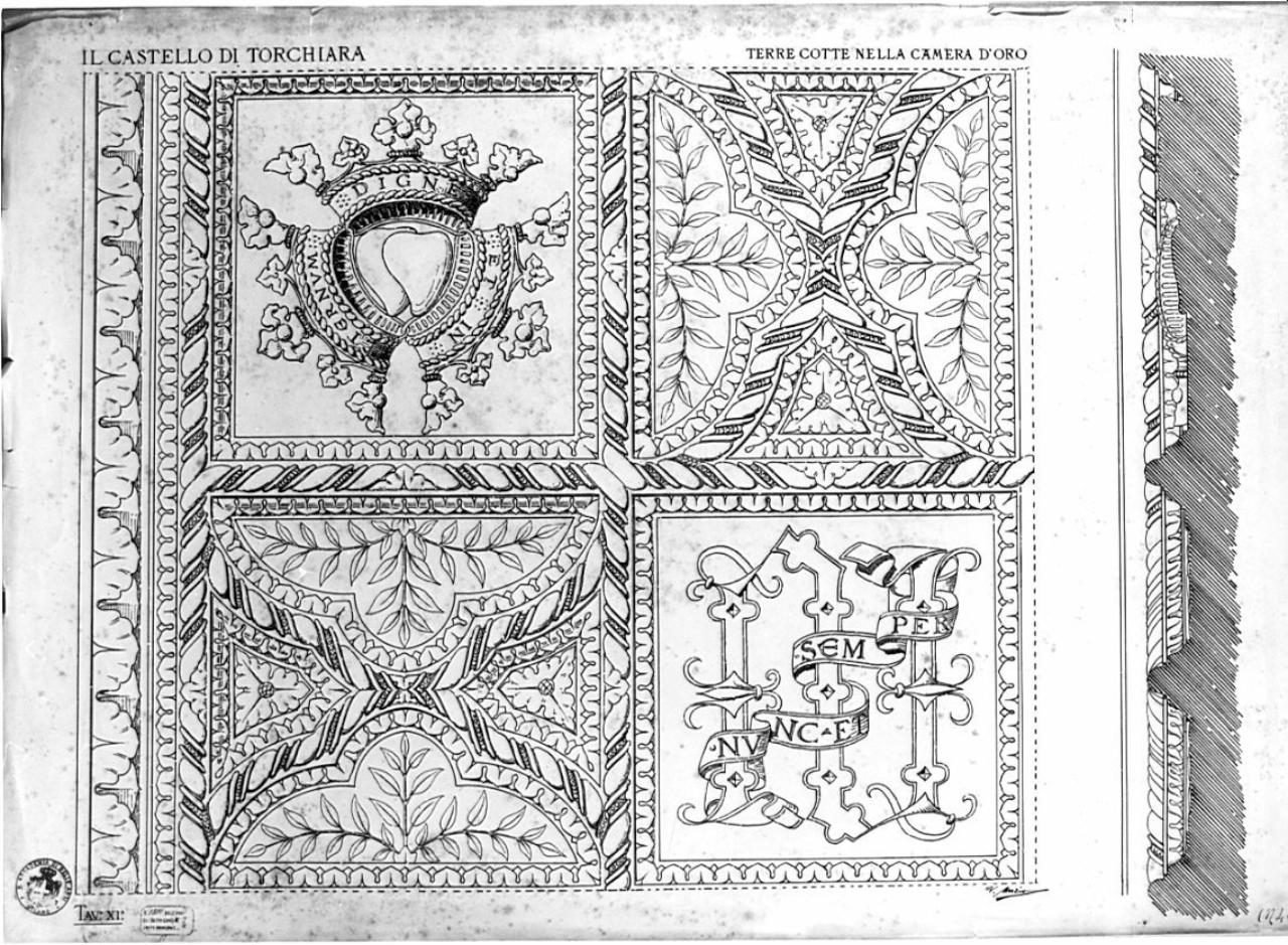 Sul recto: rilievo e studio di restauro del castello di Torchiara: particolare di parete della Camera d'Oro. Prospetto e linea di sezione verticale di parte di motivo decorativo. Il disegno è tratteggiato sui bordi inferiori e superiori e a destra la sezione. Da sinistra una cornice composta da foglie e torciglioni. Questi ultimi si diramano per formare motivi ornamentali a losanghe.
