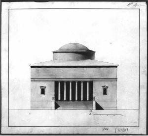 Alzato di edificio a china e bistro su fondo chiaro entro linea di margine a china.\nProspetto rettangolare con portico centrale preceduto da gradinata. Ai lati due aperture timpanate rettangolari.\nCornice liscia superiore e cupola ribassata preceduta da gradoni.