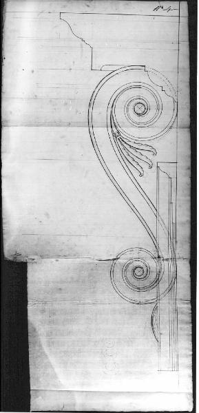Alzato di mensola: profilo e sezione. Il foglio è ripirgato in tre parti con linee a matita.