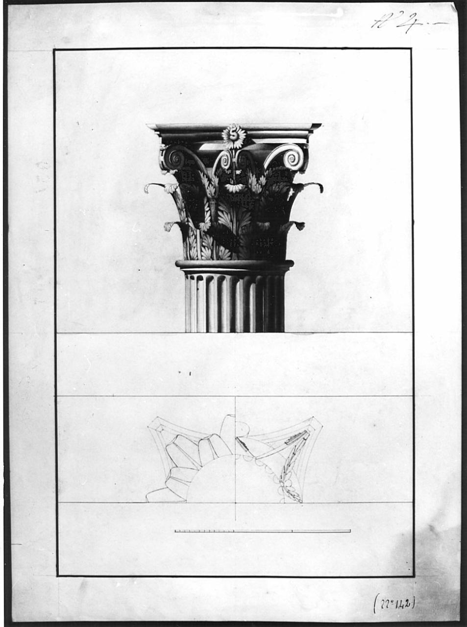 Piante e alzato di capitello corinzio a china, bistro e acquerello azzurro su fondo chiaro entro linea di margine a china. Info: sezione a due livelli del capitello. Sup.: alzato del capitello con porzione di colonna con scanalature a pianetto su fondo campito in azzurro.