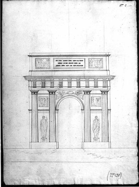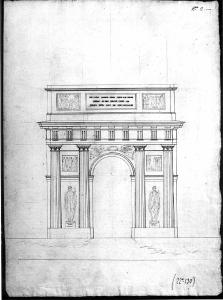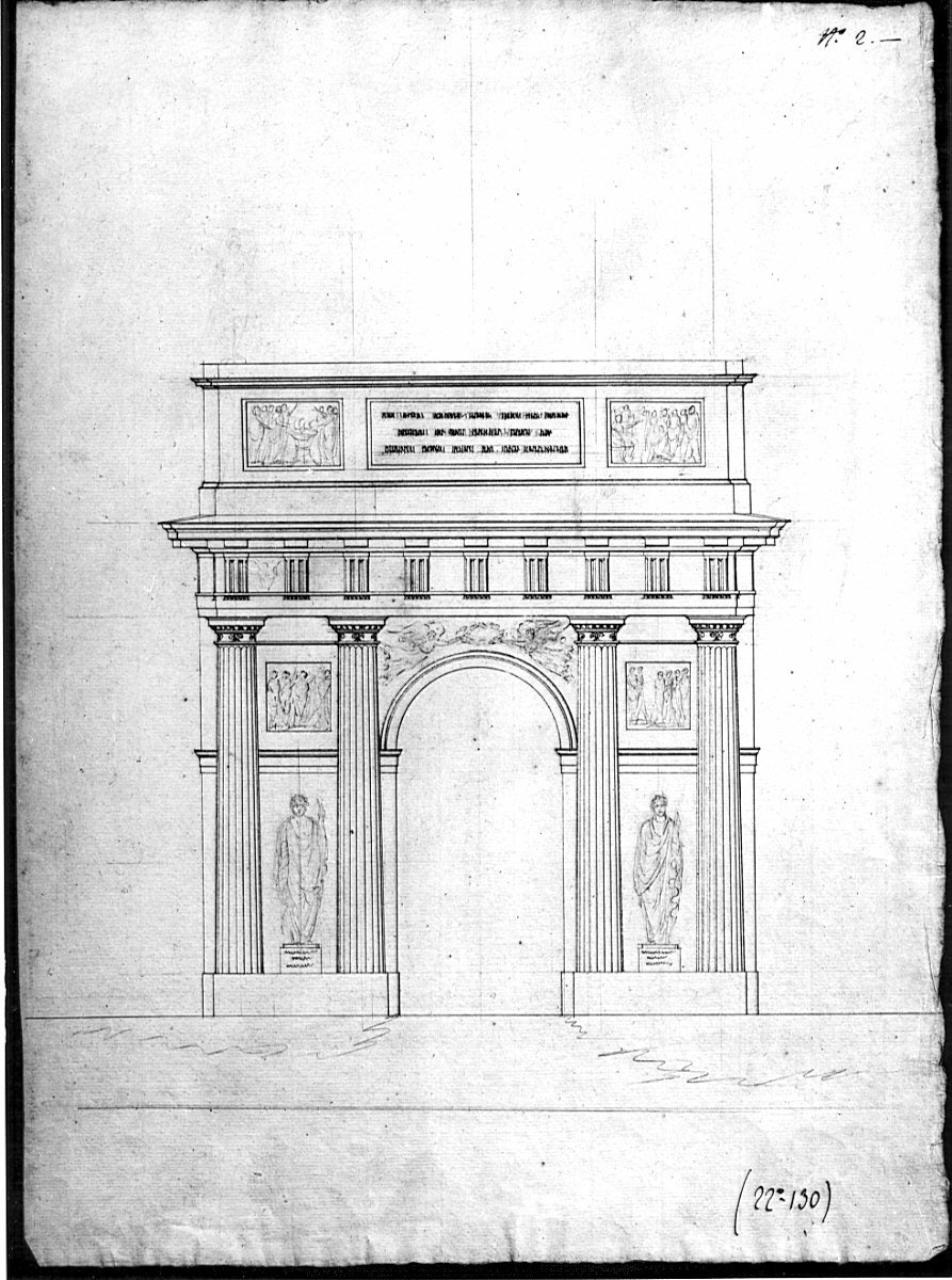 Alzato di arco trionfaIe a china e matita su fondo chiaro. Prospetto di arco a fornice co con due colonne scanalate tuscaniche sui piedritti intervallate da statue tonacate a matita. Architrave e fregio con metope e triglifi. Attico con iscrizione centrale e bassorilievi laterali.
