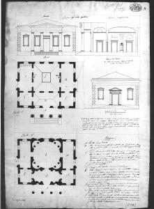 due piante e tre alzati relativi ad un edificio centrale a, china e matita su fondo chiaro entro linee di margine a matita, con spiegazione del progetto in inchiostro seppia a destra, inferiormente. Sinistra: piante rettangolari del piano terra e del primo piano con pronao tetrastilo, in cui sono evidenziate le sale per il cmmercio, i vani di servizio e le coperture; prospetto dell'edificio con pronao, aperture: simmetriche e copertura a falde. Ds.: alzato del fianco dell'edificio con pronao, aperture simmetriche e copertura a falde. Destra: alzato del fianco dell'edificio e sezione longitudinale.