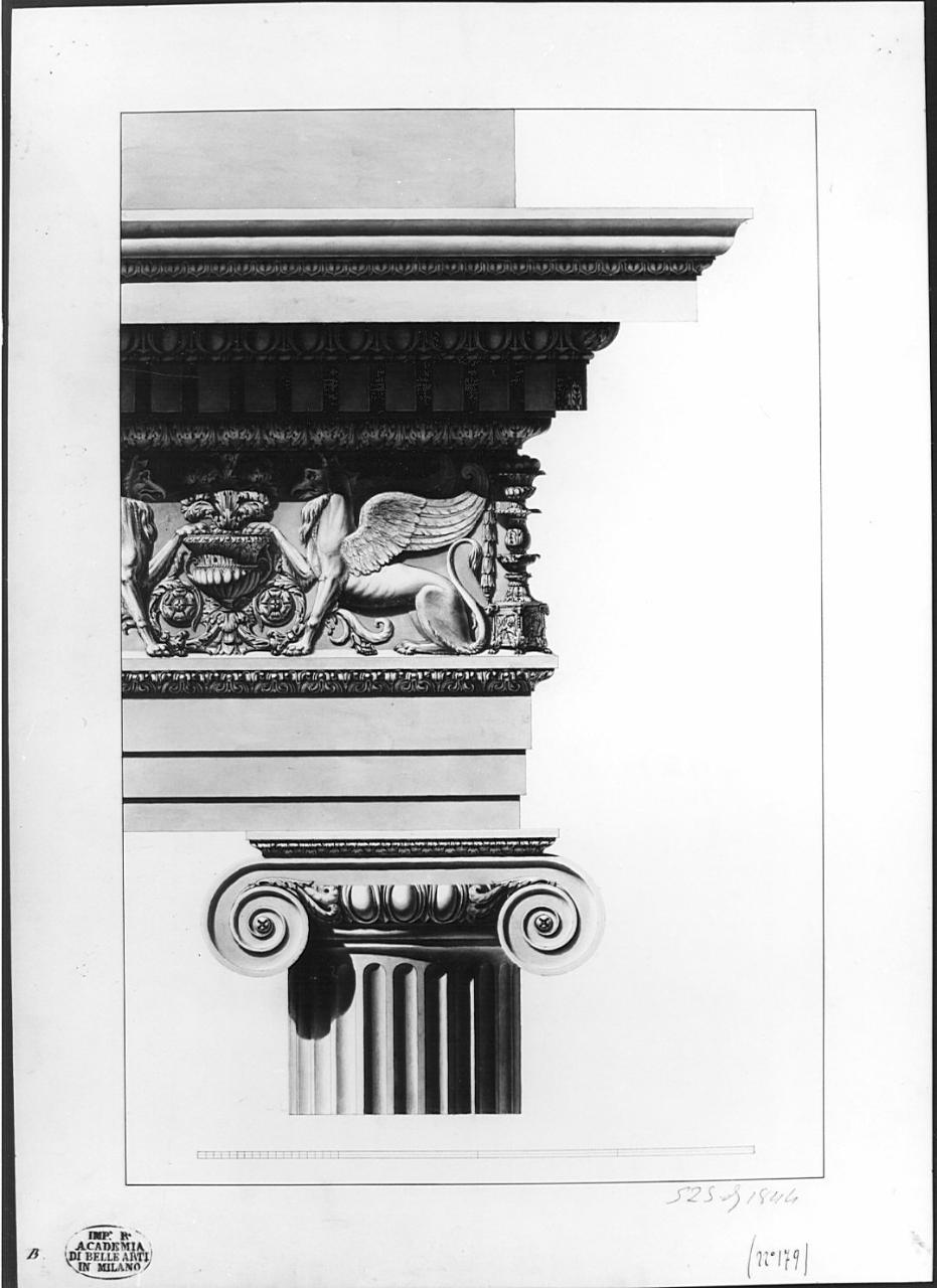 Alzato, pianta e profilo di trabeazione ionica con vista di parte del fusto con scanalature a pianetto delle volute del capitello, dell'architrave tripartito e del fregio con grifoni e lanterne. Cimazio terminale.
