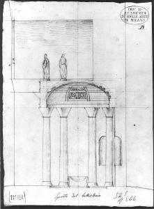 Sezione del battistero a matita su fondo chiaro con zone ombreggiate a tratteggio. Sezione con vista di quattro colonne schizzate, della vasca centrale e della cupola di copertura in cui sono evidenziate parti dei lacunari. Superiormente: vista della volta dell'arco e di statue. Sul verso: schizzi a matita con cerchi ed ellissi.