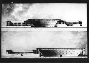 - NOTIZIE STORICO CRITICHE Il disegno fa parte di una serie di tre tavole conservate nella cartella 12 che raccoglie numerosi saggi di concorso rifiutati dalla Commissione esaminatrice. Il progetto è relativo al concorso di prima classe per l'architettura dell'anno 1805 ed era destinato ad essere restituito al concorrente.