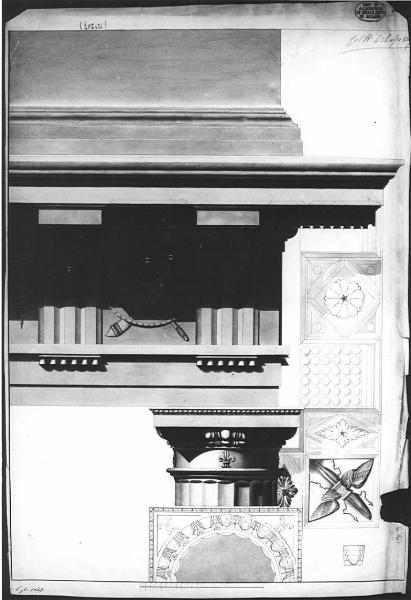 - NOTIZIE STORICO CRITICHE Il disegno è relativo ad una prova di conoscenza degli ordini architettonici (?). E' conservato nella cartella 12 che raccoglie numerose prove di concorso di Prima classe rifiutate dalla commissione esaminatrice, prove di ammissione alla pensione romana e alcuni progetti di Zanoja.