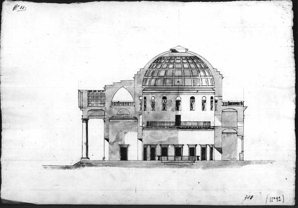 Sezione di edificio a china, bistro e acquerello rosa e azzurro su fondo chiaro. Sezione di edificio circolare preceduto da un pronao con vista del vestibolo e della sala circolare in cui è collocata una vasca al centro, una serie di porte modanate e un ballatoi. Superiormente: copertura con volta a cupola cassettonata.