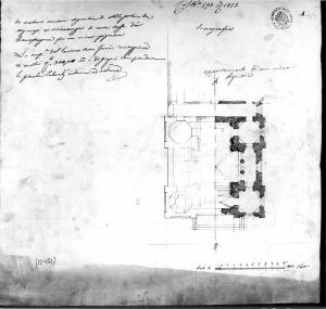 Pianta centrale di una sacrestia da collocarsi in un palazzo di campagna a matita su fondo chiaro. Tavola che comprende spiegazione del progetto a matita a sinistra e disegno a destra. Destra: pianta quadrata con cappelle angolari con sezione muraria a matita tratteggiata.