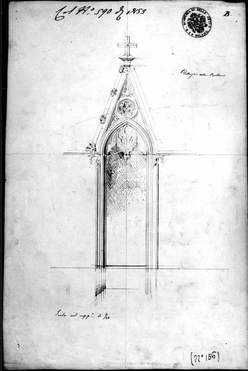 Alzato di porta gotica a matita su fondo chiaro. Parte rettangolare sormontata da arco a sesto acuto e da rosone centrale che termina con cuspide a croce greca. Ombra interna a tratteggio.