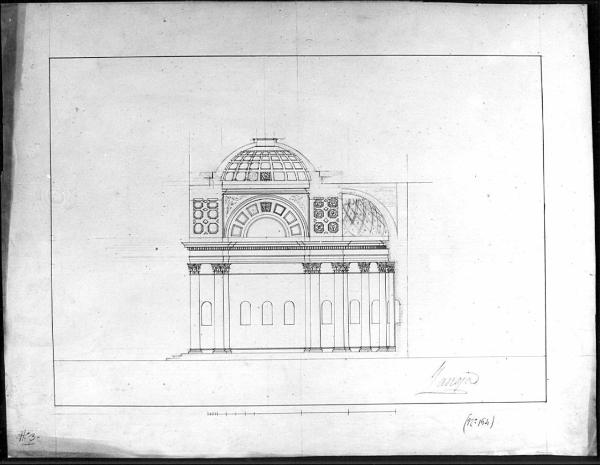 Sezione di cappella a china su fondo chiaro entro linea di margine a china. Vano centrale con abside e copertura a cassettoni lungo le pareti del vano paraste con capitelli corinzi.