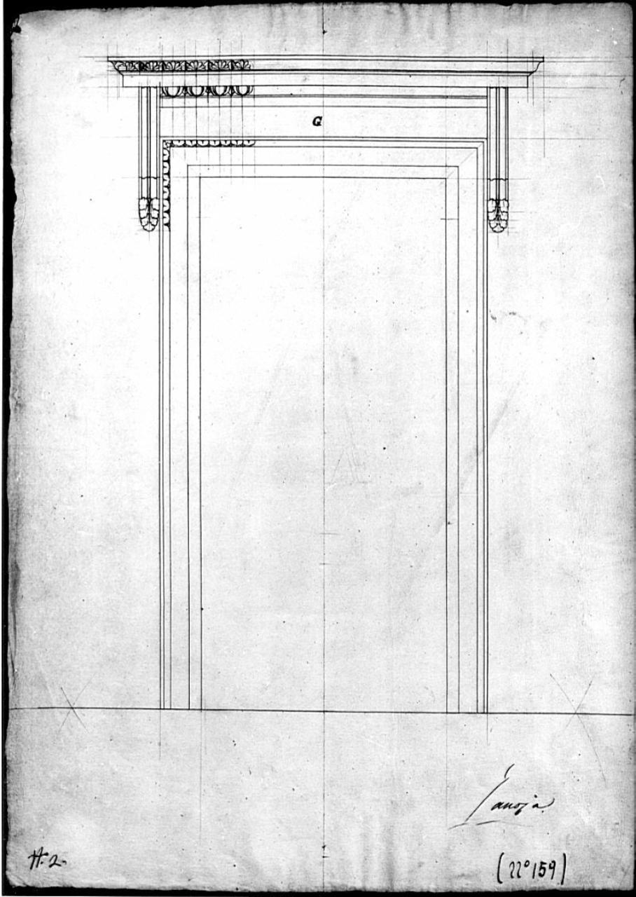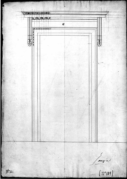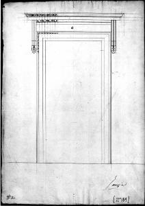 Progetto non finito di porta rettangolare con mensole e architrave superiore a china e matita su fondo chiaro. Il disegno è diviso verticalmente in due parti al centro con una linea a matita. Sul verso: linea a matita di schema rettangolare e due cerchi di compasso.