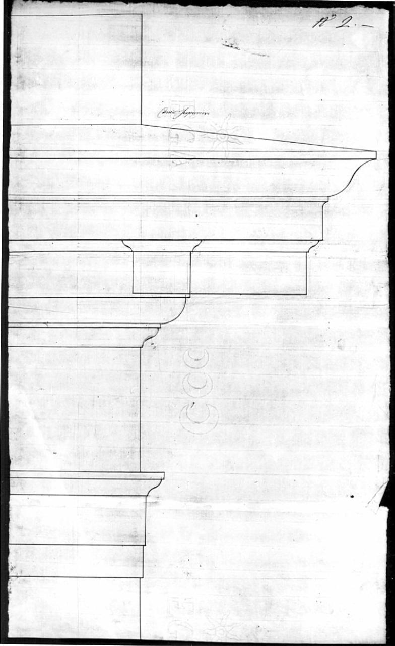 Profilo di trabeazione a china su fondo chiaro su due fogli incollati di cui uno di dimensione inferiore e ripiegato in due.