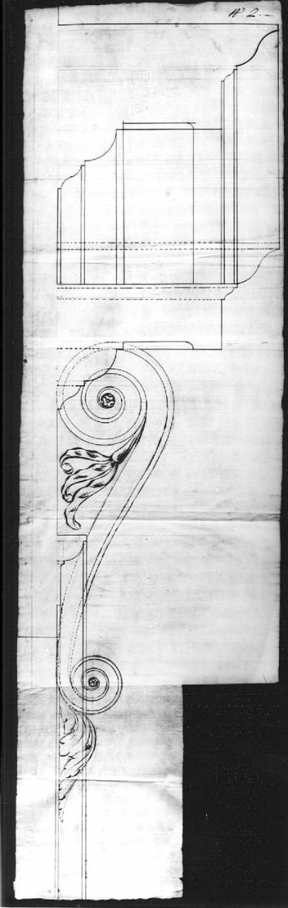 Profilo e sezione di mensola a spirale su fondo chiaro, ripiegato in tre parti, di cui una misura inferiore. visibile tracce di matita e linee a tratteggio per le sezione.