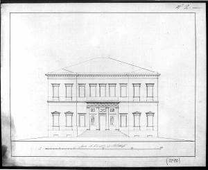 Prospetto di edificio a china e matita su fondo chiaro, entro linea di margine a china. Alzato di edificio simmetrico con ingresso centrale preceduto da gradinata e fornita di quattro colonne di ordine gigante con capitello conico, intervallate da due statue togate inferiormente, due bassorilievi superiormente. Serie di aperture modanate di forma rettangolare.