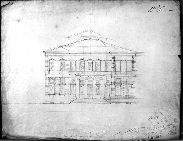 Prospetto di edificio a matita su fondo chiaro con tracce di linee a china e matita nell'angolo inferiore a destra. Alzato di edificio a due piani, preceduto da gradinata centrale, quattro colonne di ordine gigante ioniche con fregio e timpano superiore.\nInferiormente: muri a bugnato liscio con aperture e mezzanini: superiori.\nSuperiormente: serie di aperture in porte timpanate. Copertura con schizzo di cupola centrale.