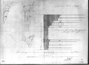 Disegno a china e matita con acquerello rosa per la sezione della trabeazione corinzia su fondo chiaro. Sezione orizzontale di porte del capitello corinzio, alzato della trabeazione del capitello e profilo dello stesso.