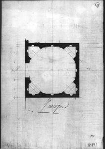 Pianta di cappella a china e matita su fondo chiaro. Pianta ottagonale con nicchie triangolari su quattro angoli e apertura. Visibili nicchie interne semicircolari. Tracce di matita e quote, sinistra linea di sezione AB a matita.