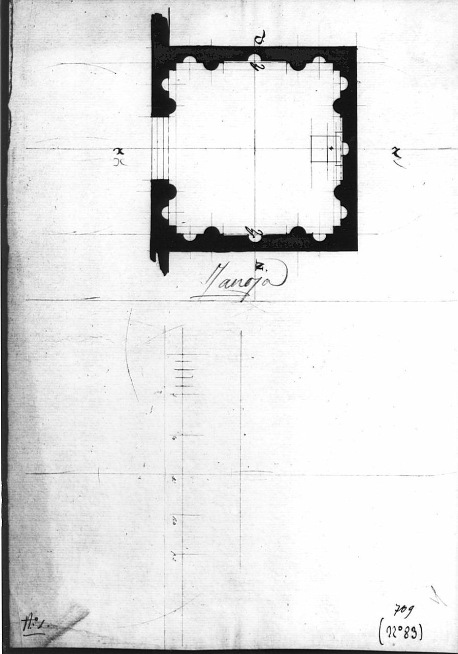 Pianta di cappella a china e a matita su fondo chiaro. Pianta quadrata con sezioni delle murature a china nera, con apertura e altare prospiciente. Lungo le pareti semi colonne addossate e nicchie. Linea di sezione X Z.