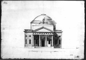 Progetto di edificio centrale a china e bistro su fondo chiaro. Prospetto di edificio centrale con pronano fornito di colonne tuscaniche, fregio dorico e timpano. Pareti a bugnato liscio con balaustra supo al centro tamburo con cupola ribassata. Statua allegorica con tridente su base a gradoni centrale.