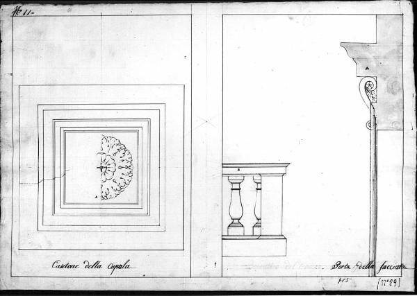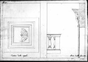 Alzati e sezioni di lacunare, di una porzione di balaustra e sezione di un portale a china e acquerello rosa su fondo chiaro entro linea di margine a china nera. Sinistra: veduta dal basso verso l'alto di metà lacunare e sezione della cornice. Destra: alzato di balaustra con balaustrini e profilo di porta classica.